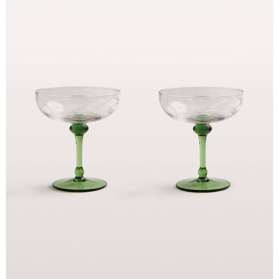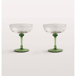 The subtle leaf detail on the clear glass bowl is an unexpected touch which paired with the green glass stem makes this Champagne coupe glass set something to be cherished.