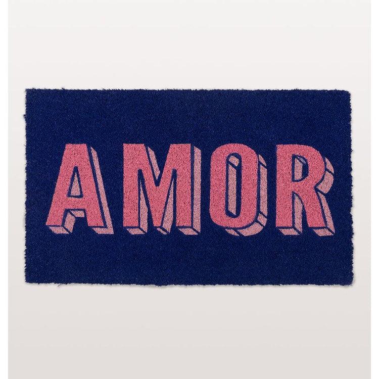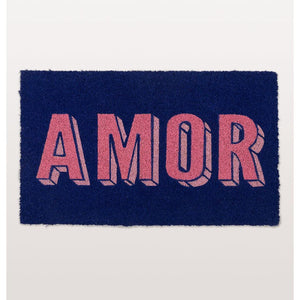 Blue and pink design with AMOR, the Spanish word for love in bold type.