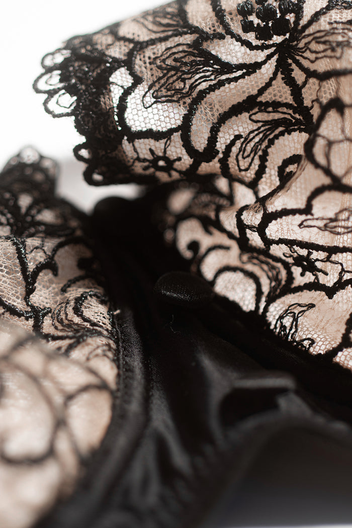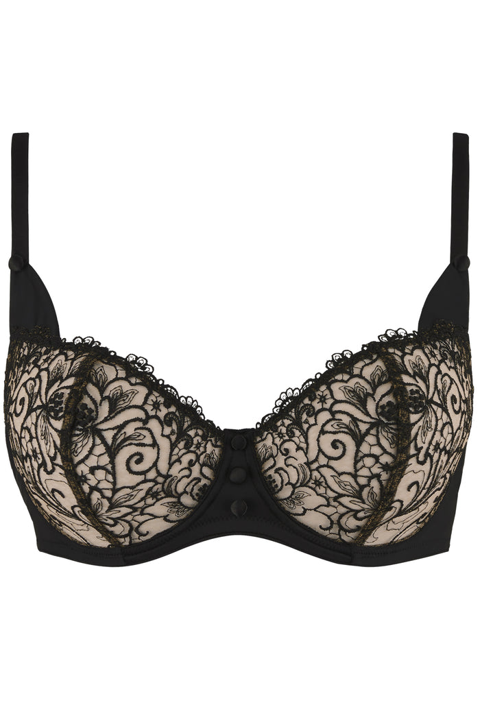 Bold and unapologetically sexy, the Miss Karl Half Cup Bra from the Karl Lagerfeld x Aubade lingerie capsule collection adorns your bust with the finest Swiss embroidery and soft satin. The sheer Guipure-style Swiss embroidery fabric on the cups offer a peek of skin beneath and soft black satin highlights your curves. Satin-covered buttons echoing Karl Lagerfeld's legendary dinner jacket sit between the cups and on the shoulder straps of the ultimate finishing touch to this luxurious black bra. Pair with the matching tanga and waist cincher for an elegant, Parisian chic look.