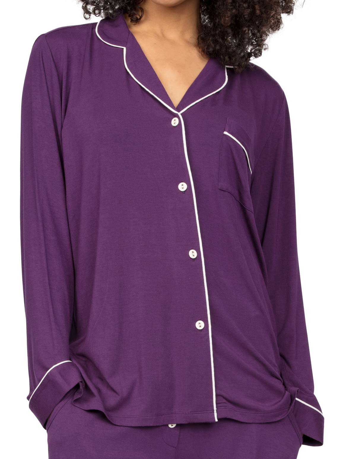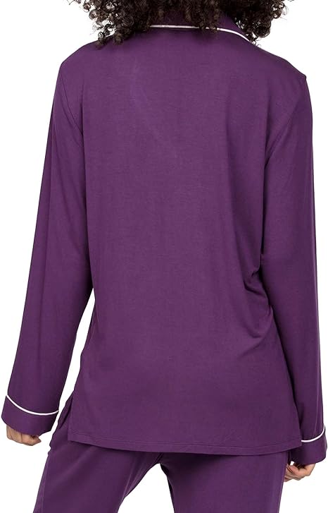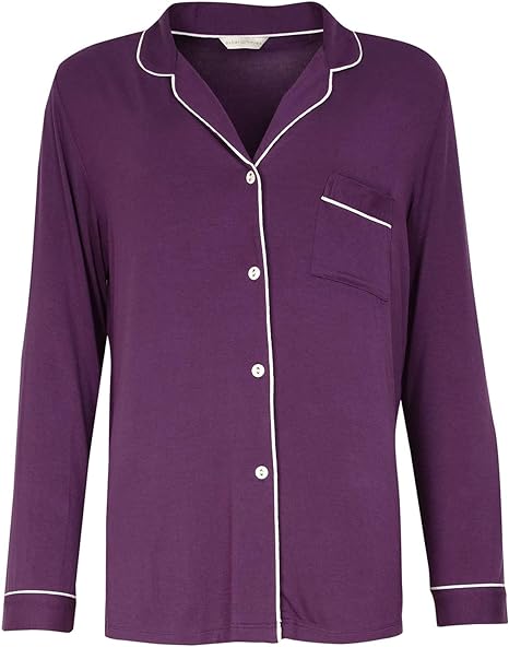 The sleek Cyberjammies Margo 4976 Purple Modal Pyjama Top 14 is made from soft and breathable modal fabric, offering optimal comfort and style combined. Boasting a classic notch collar and easy-access button closure, this top is sure to become a favorite for a peaceful night's sleep.