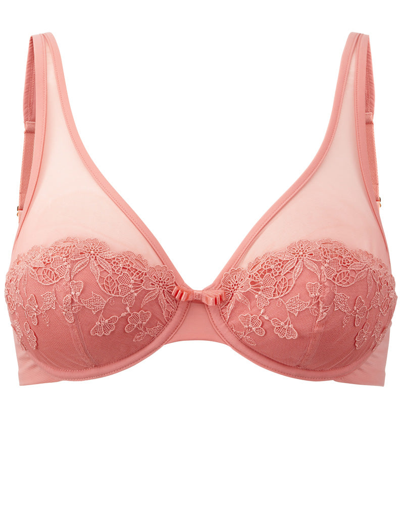 Femininity is at the forefront of this delicate pink bra with a sheer high apex for attractive plunge shaping. Floral appliqué embroidery on cups. Open back straps for unique design. Makes a charming set with matching shorts or thong.