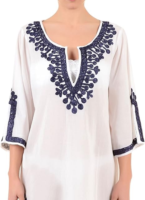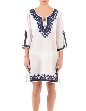 The Iconique IC7-095 White and Blue Embroidered Kaftan is a stylish statement piece. Crafted of 100% cotton for a cool, natural feel, it features beautiful Italian design elements and intricate embroidered detailing. The comfortable, loose fit makes it a versatile piece that looks great over swimsuits, shorts, or pants. Perfect for any summer day.
