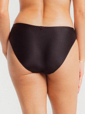 Embroiderd Satin Bikini – Serie, the strech knit fabric makes this the most comfortable bikini and will soon become your everyday go to! A true bikini shape panty for all day comfort with a simple smooth waist band that hugs for comfort and smoothness. The center front of the panty has a geomtric embroidery giving it a luxourious high fashion egde and matches back to the popular Serie Full Cup bra. The seat of the panty is comprised of an opaque microfiber stretch knit with moderate coverage. Sewn-in cotton lined gusset for a sense of reserve and freshness.