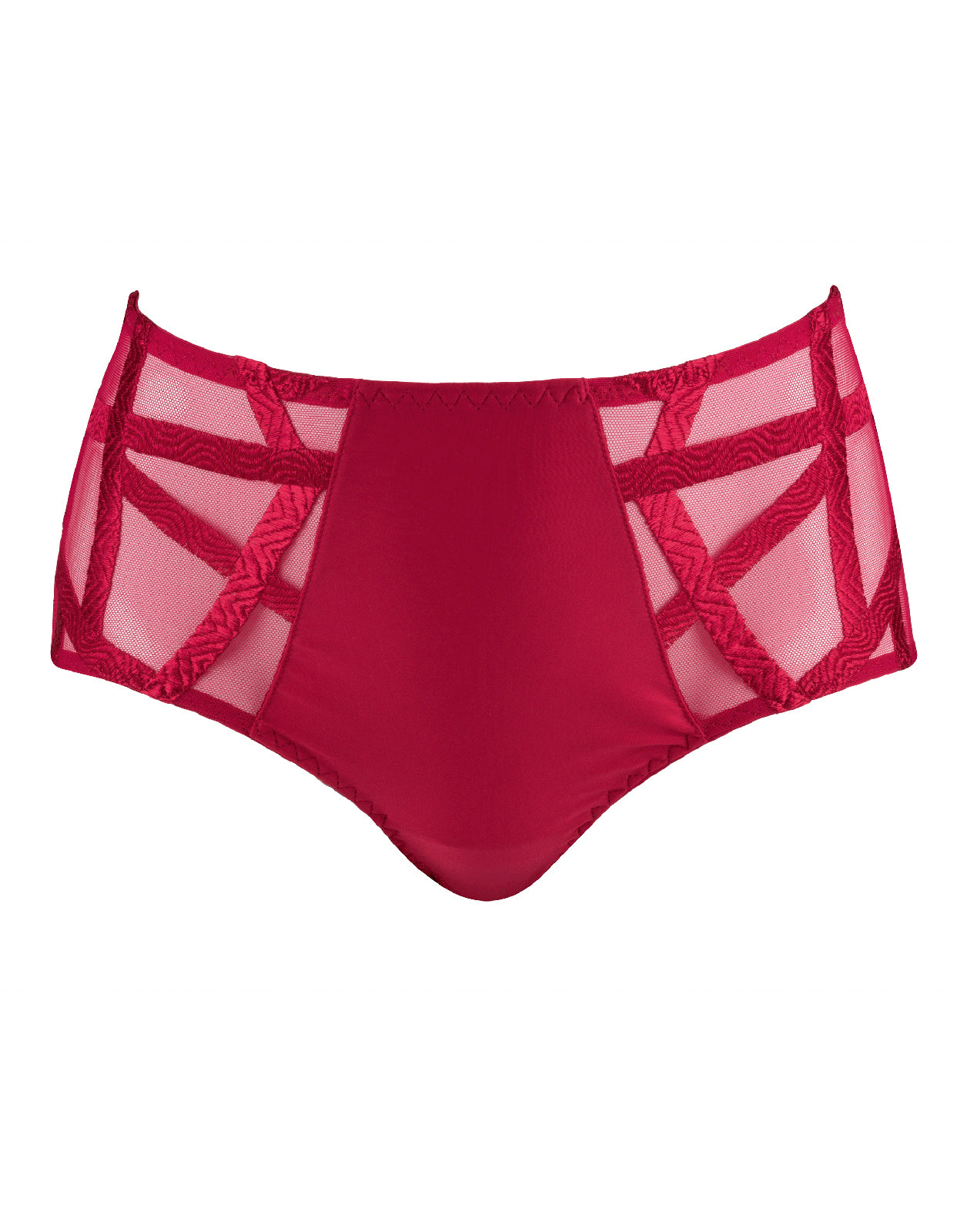 Louisa Bracq Serie Full Brief in Lipstick Red. Made in Paris with the finest French embroidery showing a geometric pattern and a bi-stretch fabric with shiny satin look. The Full Brief cuts lower on the hip for all round coverage.