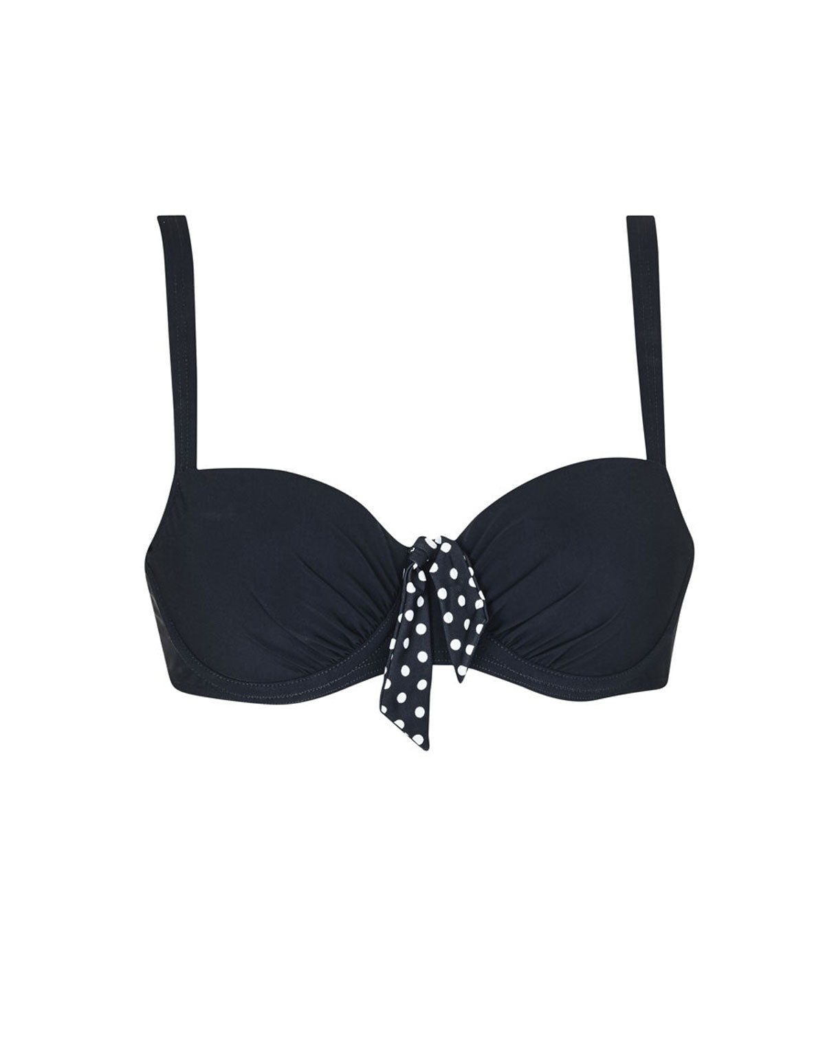 Create a chic beach look in this gorgeous bikini top. Featuring elegant polka-dot detail with bow detail between the bust. Underwired soft cups and adjustable straps for ultimate comfort.