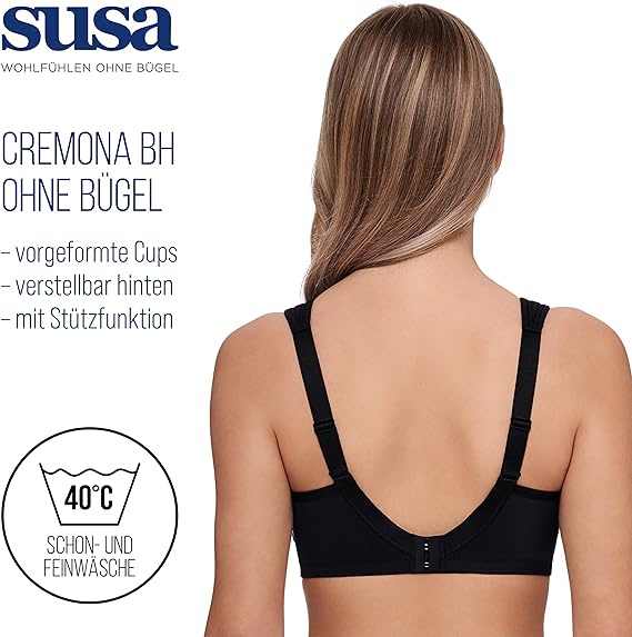 Designed with support and comfort in mind, the Susa 7761-4 Women's Cremona Black Padded Non-Wired Support Soft Bra is constructed with soft padding for added comfort and is designed to provide support without underwire. This breathable bra is ideal for everyday wear.